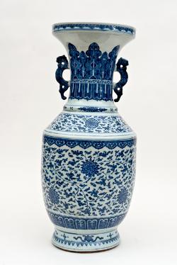 Grande vaso "bianco e blu" con crisantemi e motivi vegetali stilizzati