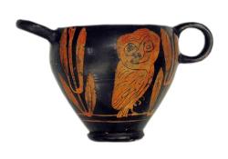 Skyphos apulo a figure rosse. Lato A e B: civetta