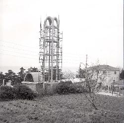 Costruzione della Chiesa di Grignano e germogli di alberi. Bora a Trieste