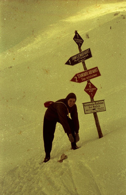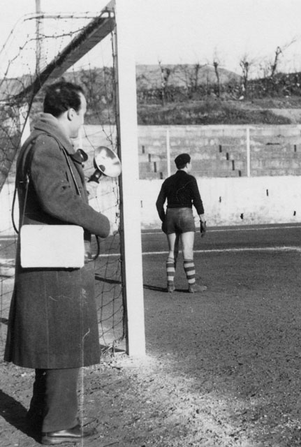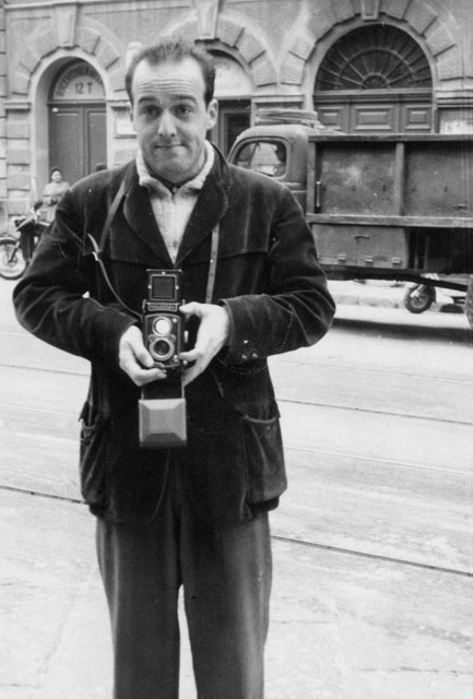 Ugo Borsatti su un prato con la sua Rolleiflex