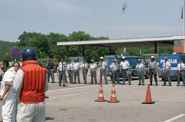 Confine, valico Fernetti, centri sociali, polizia slovena, code, file, automobili, turisti, Miljca. Tononi, Menia, Lippi.
