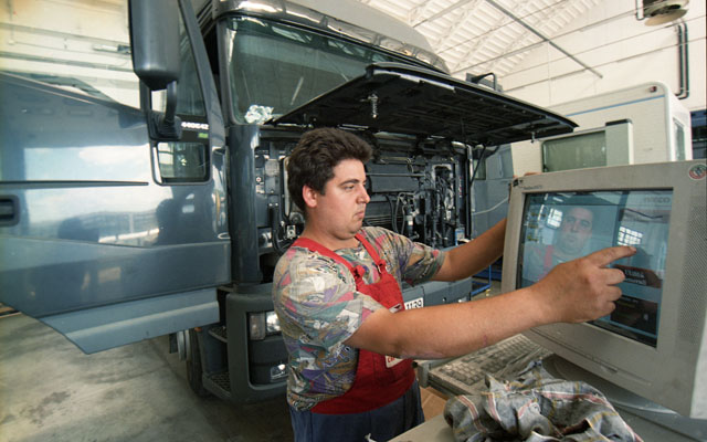 Camion, officine, meccanico, motore, computer.