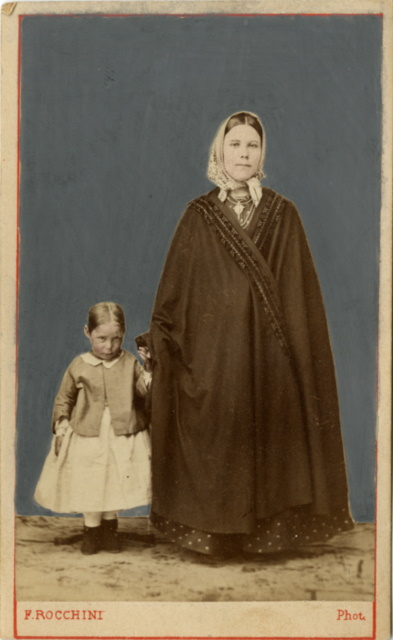 Bambina in piedi in abito bianco e cappello con mazzo di fiori