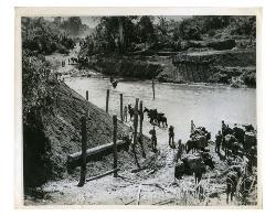 Marching south along the old Mandalay road, an American pack train fords a river where the bridge has been destroyed as the Mars Task Force joins the Allied push into central Burma