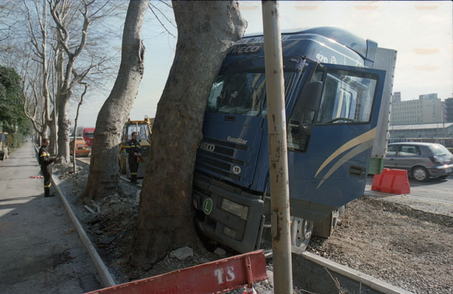 Incidente camion contro un albero. Viale Miramare, code traffico. Vigili del fuoco. Mezzi Pertot, piazza Unità. Conferenza e relatore. Camionisti poveri turchi, Riva Traiana, HP. Trasporti.