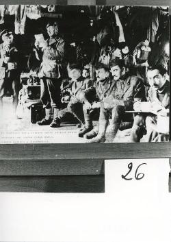 Interno della baracca: l’angolo della “Caterina”, la radio ricevente costruita con mezzi di fortuna. La squadra addetta alla diffusione delle notizie.