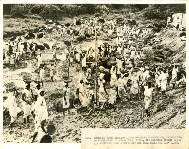 Donne impegnate nella costruzione della strada di Assam portano cesti pieni di terra sulla testa