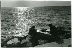 Anni 1960-'70 Mare sporco, motovedetta V.F. ; turista dorme a terra accanto auto