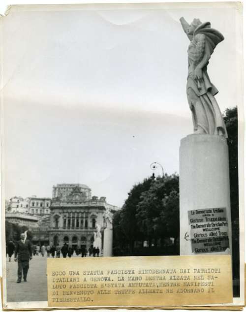 ECCO UNA STATUA FASCISTA RIMODERNΑΤΑ DAI PATRIOTI ITALIANI A GENOVA. LA MANO DESTRA ALZATA NEL SALUTO FASCISTA ESTATA AMPUTATA, MENTRE MANIFESTI DI BENVENUTO ALLE TRUPPE ALLEATE NE ADORNANO IL PIEDESTALLO.