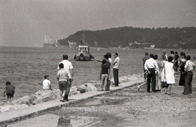 Anni 1960-'70 Mare sporco, motovedetta V.F. ; turista dorme a terra accanto auto