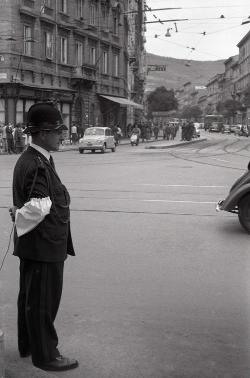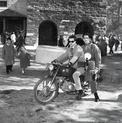 Fotografi Marcello Bari e Bruno Kerbavcich in moto e vigile urbano a San Giusto