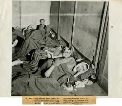 Like human skeletons, unkempt, starved, filthy and diseased, these French political prisoners die on the floor at stalag XB at Sandbostel waiting to die. The Prison Camp contained many political prisoners of all nationalities as well as allied soldiers and hundreds died daily