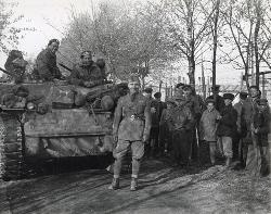 Fallingbostel, 14 aprile 1945, il caporale Guido Sinopoli del commando italiano, accanto a un carro armato dei liberatori