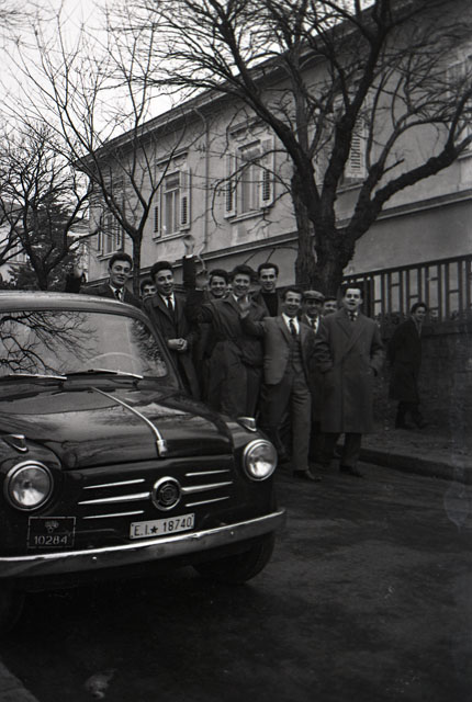 Coscritti 1939 all'uscita Ufficio leva ; Segnale “strada sdrucciolevole” viale Miramare (curva “Piccolo Mondo”)