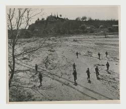 Marching south along the old Mandalay road, an American pack train fords a river where the bridge has been destroyed as the Mars Task Force joins the Allied push into central Burma