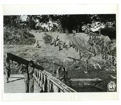 U.S. soldiers in Burma action cross a bamboo footbridge