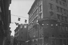 Il ritorno di Trieste all'Italia. Cortei e assembramenti nelle vie cittadine. Bandiere italiane esposte alle finestre.