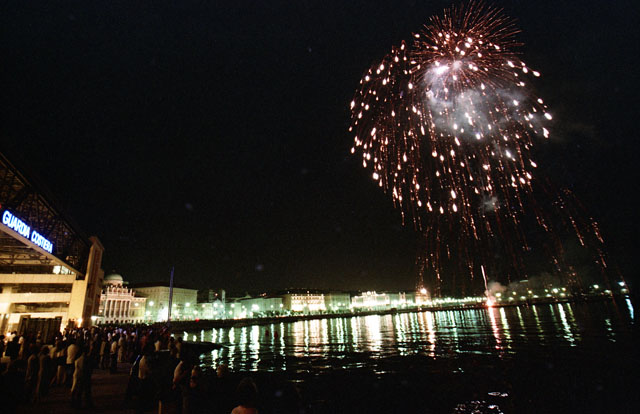 Fuochi d'artificio, rive di Trieste, stazione marittima, Faro della Vittoria, panoramiche Trieste.