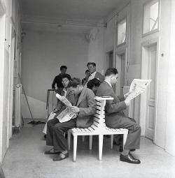 Anni '60 Giorgio Fonzari in ufficio con colleghi ; esercente (bar - pizzeria)