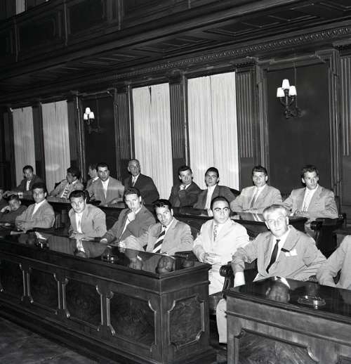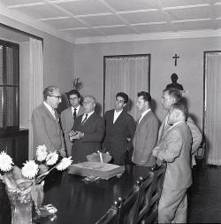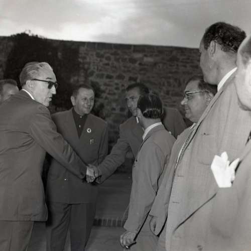 Ministro Emilio Colombo all'inaugurazione del Mercato ortofrutticolo, all'Istituto Talassografico e in Comune col sindaco Bartoli e le guardie d'onore del Comune