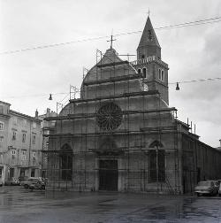Auto e pullman jugoslavi sulle Rive ; Turisti ; Lavori di restauro alla torre del Comune
