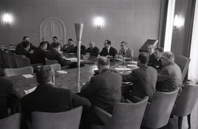 Riunione D.C. (?) : tavolo circolare, presenti on. Belci, Delise, ecc.