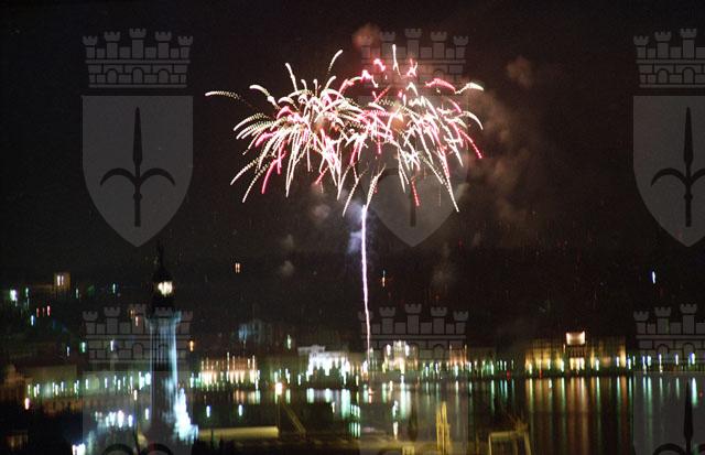 Fuochi d'artificio, rive di Trieste, stazione marittima, Faro della Vittoria, panoramiche Trieste.