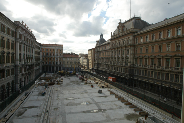 Il Sindaco Roberto Dipiazza nel cantiere del parcheggio di piazza Vittorio Veneto : sopralluogo : Trieste : 2002