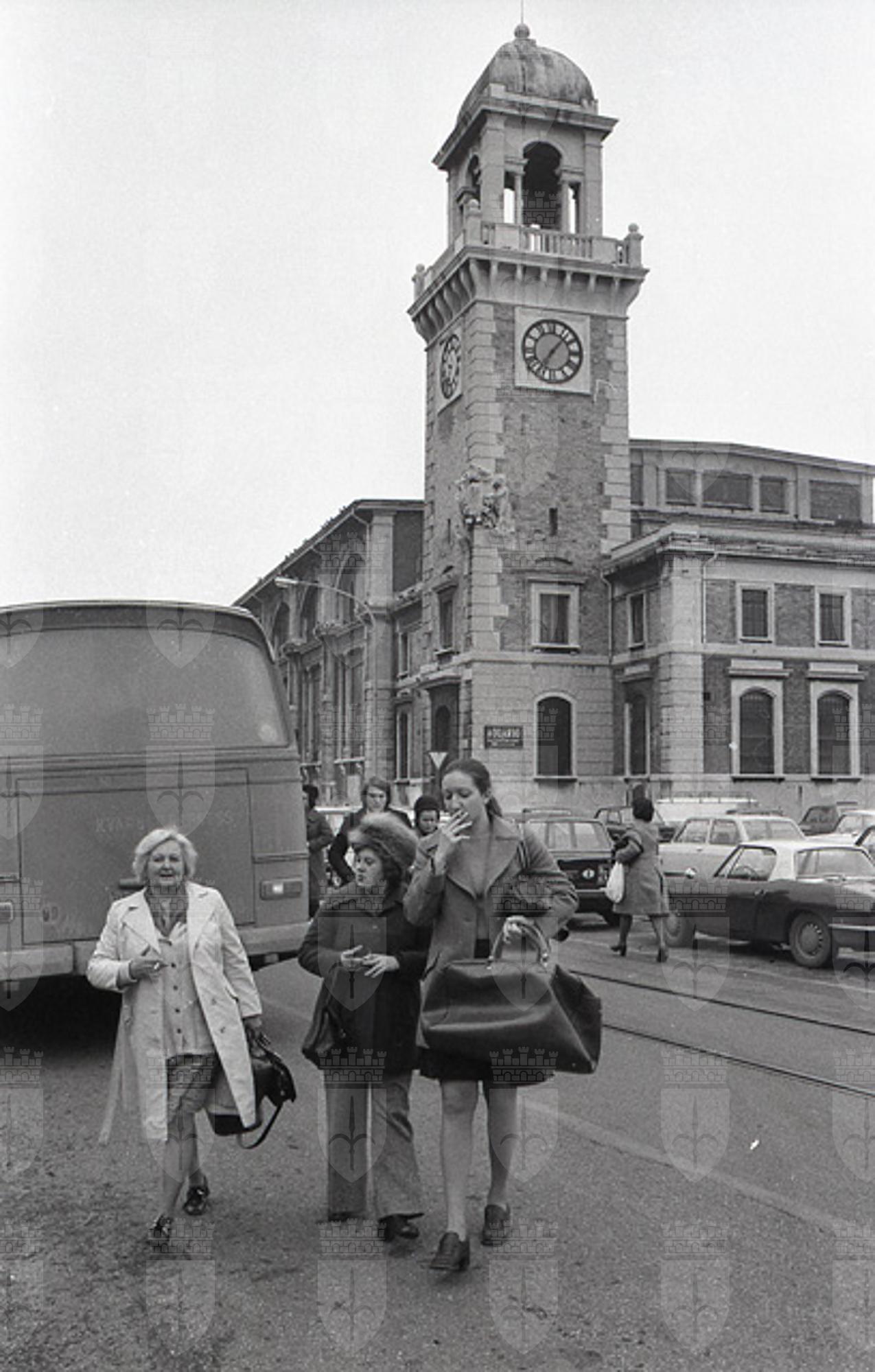 Auto e pullman jugoslavi sulle Rive ; Turisti ; Lavori di restauro alla torre del Comune