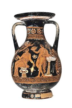 Pelike attica a figure rosse con Eros che allaccia il sandalo a una fanciulla