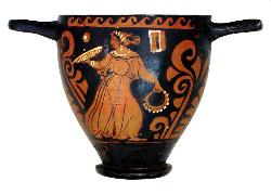Skyphos apulo a figure rosse. Lato A: fanciulla in corsa. Lato B: testa femminile