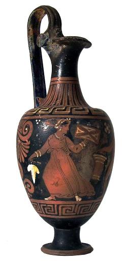 Oinochoe apula a figure rosse con fanciulla in corsa e giovane nudo