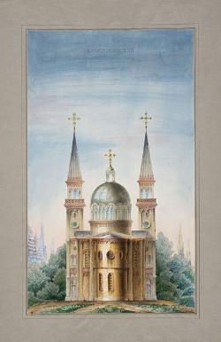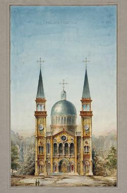 Progetto di chiesa con due campanili laterali e cupola