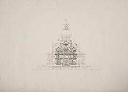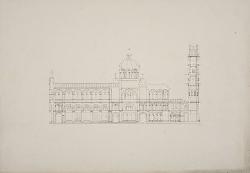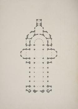 Progetto di chiesa in stile romanico con pianta a croce latina, con campanile posteriore