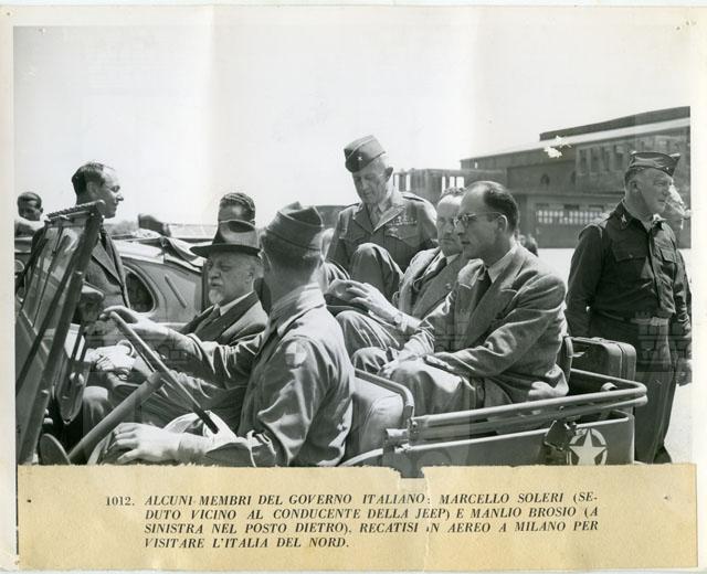 ALCUNI MEMBRI DEL GOVERNO ITALIANO: MARCELLO SOLERI (SEDUTO VICINO AL CONDUCENTE DELLA JEEP) E MANLIO BROSIO (SINISTRA DIETRO), RECATISI IN AEREO A MILANO PER VISITARE L'ITALIA DEL NORD.