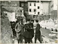 Trieste, Museo di Storia ed Arte : i principi Umberto e Maria di Savoia escono dall'inaugurato nuovo ingresso del Museo. Presso il cancello (a sinistrra di chi guarda) il Podestà sen. Pitacco, a destra il pittore Guido Cadorin