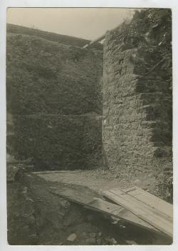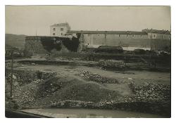 Trieste, scavi a S. Giusto sul fondo ex - Popper : abside col muro sopraelevatovi che parte dal castello e muro interno di sostegno