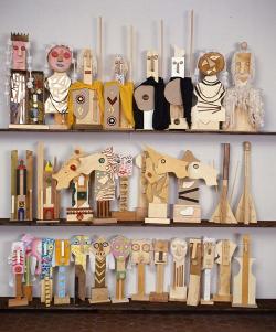 Vetrine di Anita Pittoni contenente tende e tessuti da arredamento con giocattoli e oggetti per bambini