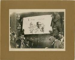 Bologna : Partenza dei volontari del 35° Fant. Sulla vettura ferroviaria caricatura italiana: "L'ultima... risorsa" Per Trieste - Vienna - Schronbrunn