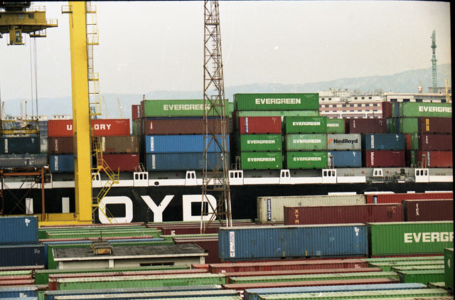 Molo VII: gru, container, Cavalieri, operai portuali, treni porta container. Fernetti, camion, dogana, finanzieri.