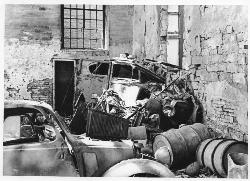 In primo piano macerie del forno crematorio, sullo sfondo un altro edificio rimasto danneggiato dallo scoppio