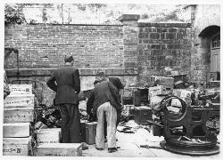 Macerie del forno con un gruppo di otto uomini in abiti civili.