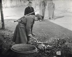Fallingbostel, marzo 1945, una sentinella da una mano a tagliare la legna