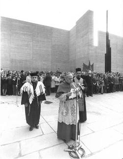 L'Arcivescovo Santin, con ai lati il Rabbino e il Parroco Serbo-Ortodosso, legge la preghiera in suffragio dei defunti