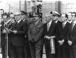 Il Presidente Leone, attorniato dalle autorità legge il discorso