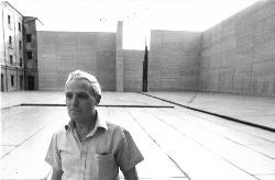 Mario Montanaro in cortile. Edificio centrale sullo sfondo