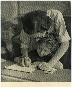 Bambini che imparano a scrivere dopo la liberazione del campo di Bergen Belsen