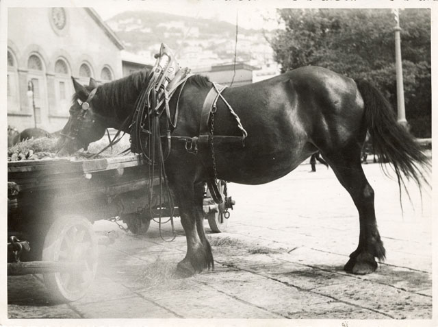 Tipico carro da trasporto trasformato in greppia per il rifornimento di un cavallo che conserva le caratteristiche bardature