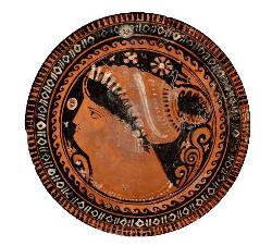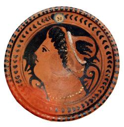 Piatto apulo a figure rosse con testa femminile.