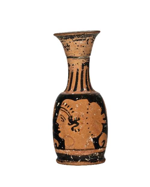 Lekythos apula a figure rosse con testa femminile.